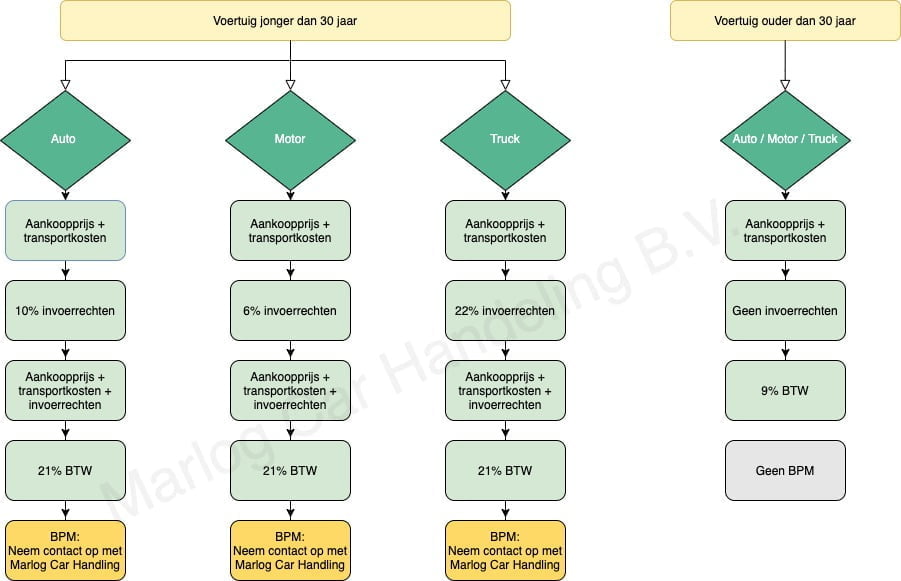 Wilt u weten welke percentages invoerrechten en BTW u moet betalen van uw auto, motor, truck of oldtimer? Bekijk onderstaand schema en vindt de percentage aansluitend bij uw voertuig